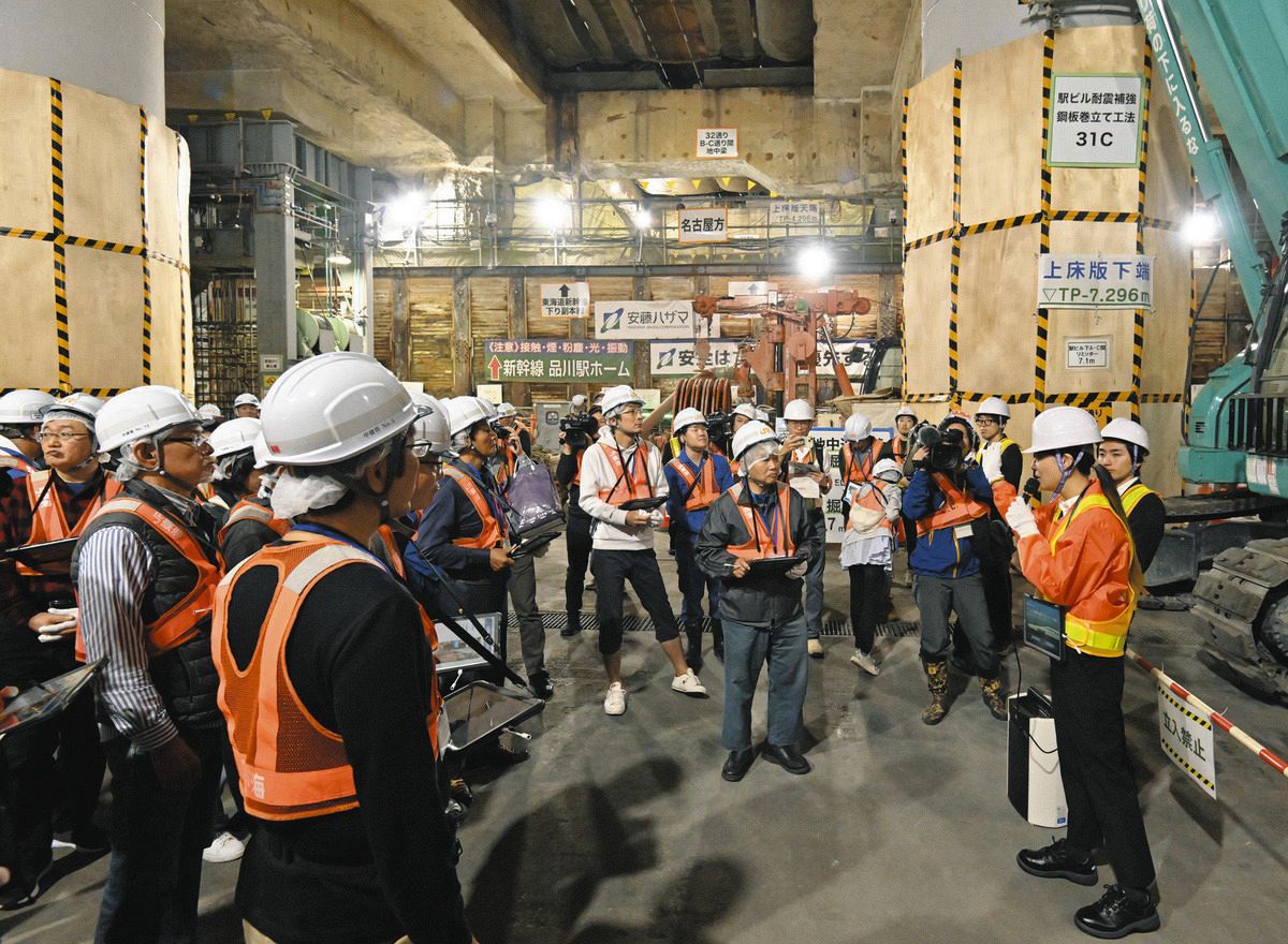 JR東海は4日、リニア中央新幹線の東京側の起点となる品川駅(東京都港区)の周辺住民を対象にした工事現場の見学ツアーを報道関係者に公開した。現場は駅地下に掘った長さ20メートル、幅60メートル、深さ13メートルの立て坑で、さらに40メートルほど深く掘ってリニア用のホームを設けるという。