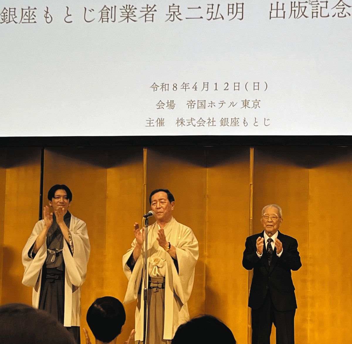 呉服店「銀座もとじ」の創業者で会長の泉二(もとじ)弘明さん(76)の自叙伝『約束銀座の人気呉服店を一代で築いた男の物語』(中日新聞社刊)の出版を記念した祝賀会が12日、東京都千代田区の帝国ホテルで開かれ、着物姿の約500人が参加した。
