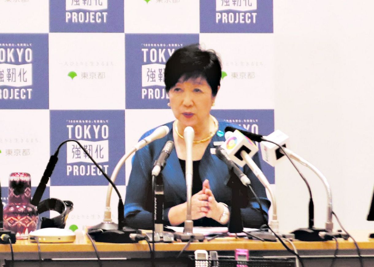 定例記者会見で話す小池百合子都知事=20日、東京都庁で