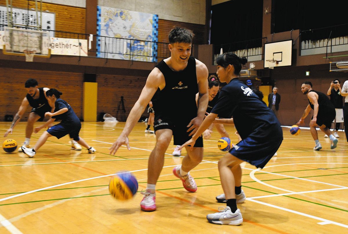 オークランドの選手たちは、巧みなドリブルやスリーポイントシュートなどを披露。女子部長の中村真梨已(まりい)さん(14)は「自分たちのチームは身長が低いので、ドリブルの技術を見習いたい」と話し、オークランドのデニム・ブルック選手(27)は「楽しい時間を過ごせて大会前にリラックスできた」と笑顔を見せた。(佐藤航)