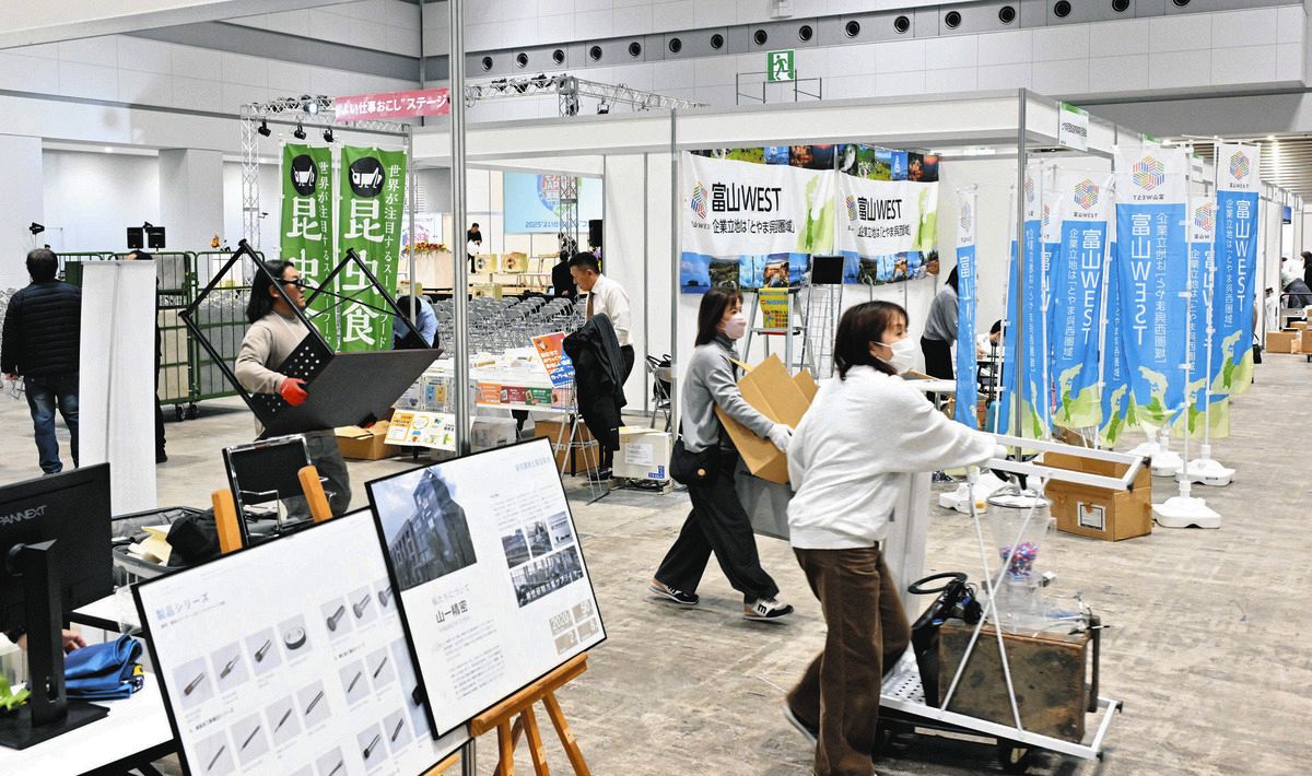 ブースが並び「2025よい仕事おこしフェア」の準備が進む会場=東京ビッグサイトで